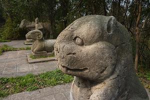 Но наш рассказ, как водится, не совсем об этих, в общем то, известных достопримечательностях. Возможно, после их посещения захочется тишины и уединения. Тогда мы рекомендуем поискать гробницы министров императора. Масштаб этих захоронений скромнее, но расположены они в почти безлюдном бамбуковом лесу на склоне горы. В зеленоватом полумраке сквозь стволы бамбука неожиданно проступают каменные фигуры животных, охраняющих покой генерала Чанг Ючуня. Еще одно захороение расположено метрах в стах к северу от него. Живые люди сюда забредают редко.