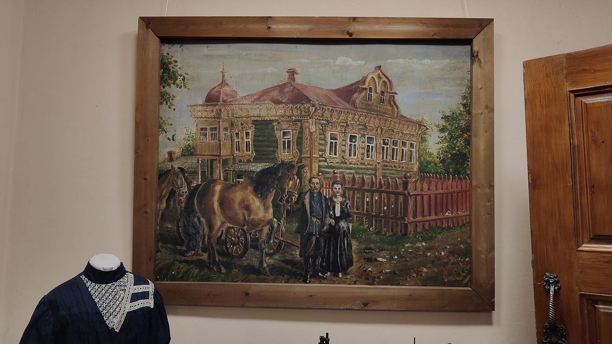 Есть среди экспонатов и заслуживающая внимания живопись. По легенде хозяин постоялого двора заказал художнику такую вот картину в уплату за проживание, так как денег у бедняги не было. Хозяин получил семейный портрет с женой, прекрасными конями и зданием, украшенным характерным и сейчас для Талдома деревянным декором.