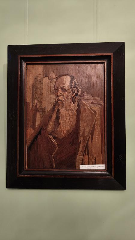 Особый интерес средстваляет портрет сидящего в кресле писателя, выполненный в технике маркетри И.Н. Ремневым в 1926 году. Деревянные пластинки разного цвета наклеены на основу, для чего использован шпон разных пород.