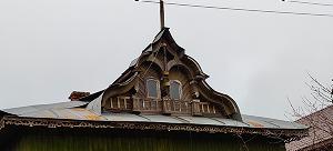 К сожалению, многие строения разрушаются, доживая свой век. Вот здесь уже проваливается крыша, сохранившаяся лишь с одной стороны отделка фронтона мансарды с полукруглым окном заполнена изящной резьбой, как и круглое навершие (ул. Салтыкова-Щедрина 34).