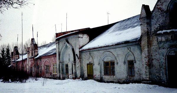 Одноэтажное здание конного двора состоит из двух длинных крыльев, соединенных под прямым углом. Боковой фасад, растянутый вдоль въездной аллеи, украшен псевдоготическими деталями. Стена состоит как-бы из трех одинаковых секций с воротами в центре и окнами по сторонам.