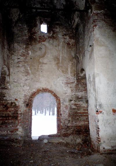 Внутри церкви не сохранилось росписей, их и не было; вдоль стен размещались саркофаги, ныне зверски выломанные. Утрачены также вмурованные в кладку надгробные доски. Теперь отсюда виден сильно заросший пейзажный парк.