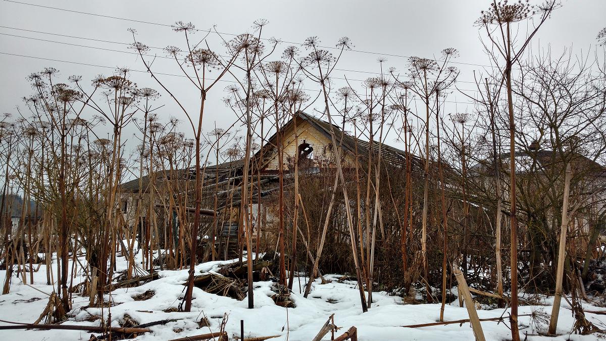 Чего нельзя сказать о некоторых других уцелевших хозяйственных постройках поблизости. Похоже, их дни сочтены, но пока еще их можно найти в зарослях борщевика.