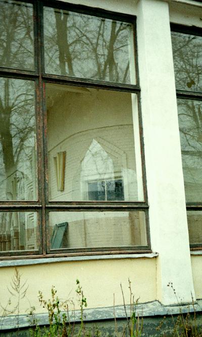 Сквозь разбитые стекла хорошо видна алтарная часть храма, с окнами, украшенными кирпичными узорами.
