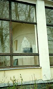 Сквозь разбитые стекла хорошо видна алтарная часть храма, с окнами, украшенными кирпичными узорами.