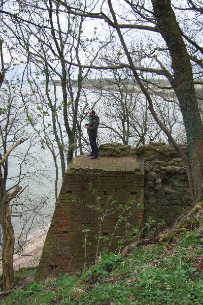 Уходящие к воде контрфорсы были облицованы кирпичем. Некоторые целы, часть укреплений, размытая прибоем, обрушилась в море. Внизу видны остатки пристани.