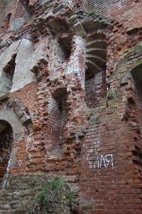 На башню (вернее, на то, что от нее осталось) можно подняться по фрагментам винтовых лестниц и выступающим кирпичам. Правда, очень высоко забраться не удастся.