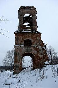 Двухярусная колокольня также лишилась своего завершения. Верхний ярус с арочными проемами звона завершается треугольными фронтонами.