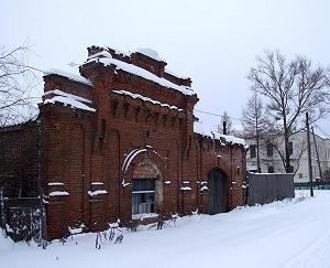 Напротив усадьбы сохранились и склады Хорошеева: два складских корпуса, на главном выложена дата постройки - 1909. Его фасад украшен аттиком с рядами зубцов и фигурных кронштейнов.