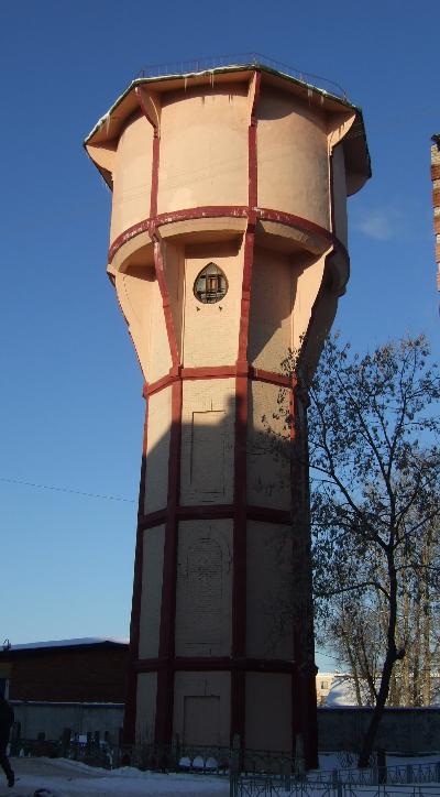 Одним из самых впечатляющих построек является водонапорная башня, выстроенная по индивидуальному проекту под влиянием стиля модерн. Кирпичное четырехъярусное восьмигранное сооружение завершается цилиндрическим объемом из бетонных блоков и восьмигранной кровлей. Окна четвертого яруса имеют оригинальную каплевидную форму.