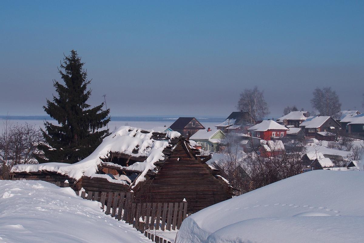 От храма открывается великолепный вид на Чухломское озеро, к которому спускаются одноэтажные деревянные домики.