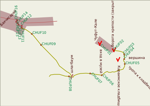 С главной улицы Бахчисарая надо свернуть направо в узкий переулок (мы затрудняемся назвать ориентир, разве что воспользоваться GPS-навигатором, точки приведены). Очень узкая дорога, заложив несколько "колен" по городу, выходит за его пределы и поднимается в гору (за пределами города дорога грунтовая). Через некоторое время дорога входит в сосновый лес и подводит к шлагбауму, расположеннному слева от нее. За шлагбаумом - источник и начало проселка к Чуфут-Кале. Пешком от шлагбаума дорога займет порядка часа, на машине, если удасться уговорить шлагбаум открыться, - совсем быстро (проселок проходим для любого автомобиля).