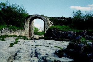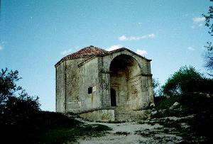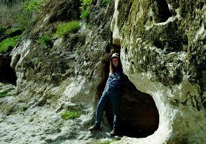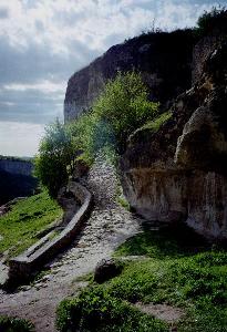 Пещерный город Чуфут-кале, расположенный рядом с Бахчисараем, достаточно известен. Однако нас занесло сюда несколько необычным путем, там, где проселочная дорога, поднявшись на плато, подходит к самым воротам города. Может быть, можно было бы "уговорить" шлагбаум внизу открыться, и торжественно подкатить к запертым воротам, но мы не стали этого делать. Пройти пешком по гребню горы, оказалось намного приятнее, тем более, что подъем не очень крутой, хотя этот путь и длиннее, чем "классический" вариант подхода (снизу), по которому обычно попадают в Чуфут-кале. Дорога идет лесом, деревья часто расступаются, открывая захватывающие виды, вплоть до далекого моря на западе. Не доходя немного высшей точки пути (дальше к городу - спуск), можно заметить небольшую лесную тропинку, уходящую влево-вниз, как будто "срезающую" петлю серпантина основной дороги. Это впечатление обманчиво - никакой дороги внизу нет, тропинка углубляется все дальше в заросшую лесом лощину и... оказывается среди странных серых камней с хорошо различимыми надписями на иврите. Это кладбище караимов - загадочного народа, населявшего Чуфут-Кале в течение сотен лет. Споры о происхождении караимов до сих пор не закончены - кто-то ведет их родословную от багдадских евреев, кто-то от древних жителей Крыма - киммерийцев, кто-то - от хазар, многие (в том числе и представители самих караимов) достаточно ожесточенно оспаривают некоторые из этих гипотез или выдвигают другие. Как бы то ни было, в середине девятнадцатого века караимы, которых в царской России признали "неевреями" и, соответственно, не ограничивали в свободе выбора места жительства, покинули Чуфут-Кале окончательно. Однако кладбище как будто действующее, во всяком случае, кажется, что некоторые надгробные камни - совсем недавнего происхождения. (или это только показалось? - Ни в чем нельзя быть уверенным в этом странном месте...). Наконец, в просвете деревьев показывается арка ворот, и таинственный серый полумрак лиственного леса остается позади. Тропинка выводит на солнечную поляну - здесь жизнь! Впереди на горе видны въездные башни Чуфут-кале, защищавшие крепость с приступа, то есть со стороны узкого "перешейка" плато, по которому подходит к воротам проселочная дорога (по ней мы бы подошли к городу, если бы не свернули на тропинку к кладбищу). В остальном город не нуждался в искусственной защите - отвесные скальные обрывы окружают его со всех сторон. Нынешний вход для туристов расположен дальше, можно либо пройти по тропинке вниз по оврагу, а затем подняться наверх ко входу, либо, если не хочется терять высоту, взять правее, пересечь травянистый склон и выйти прямо под обрывы с пещерами.