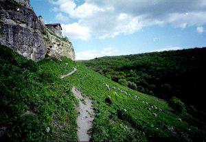 Оставив шлагбаум слева и продолжив движение по дороге, можно, миновав татарскую деревню, опять спуститься (уже другим путем) к шоссе на окраинах Бахчисарая.