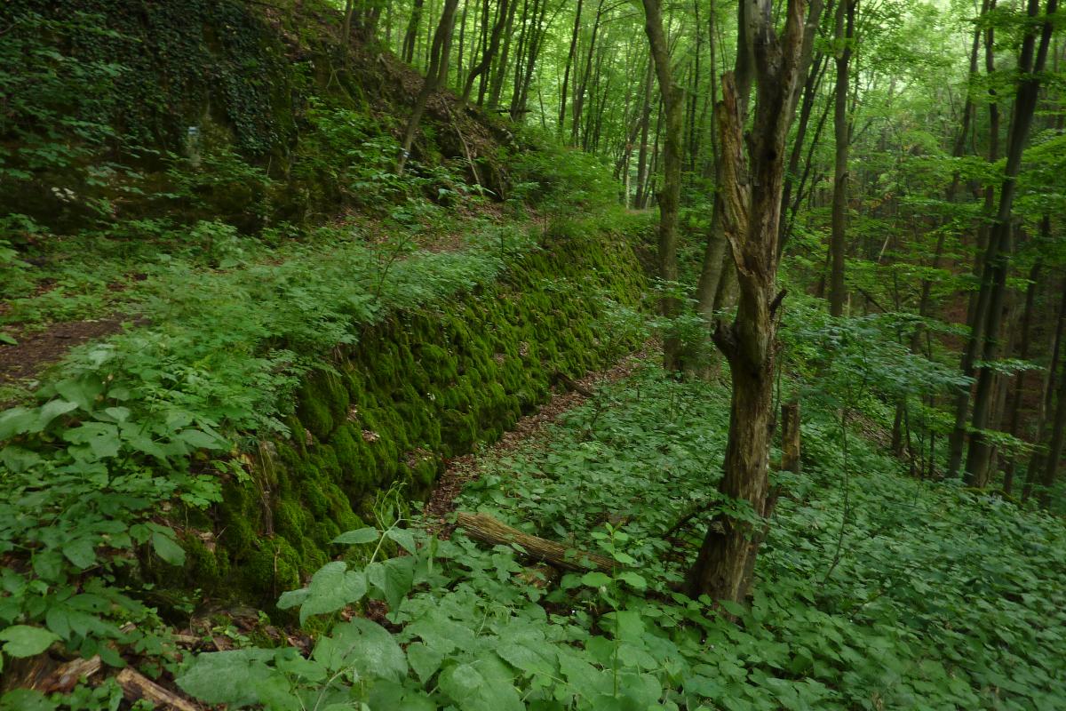 Еще не доходя ручья, протекающего по дну ущелья под замковой горой, вдруг осознаешь, что проселку под ногами не одна сотня лет. Старая подпорная стенка из заросших мхом камней свидетельствует о почтенном возрасте дороги, которая, вероятно, не моложе замка.