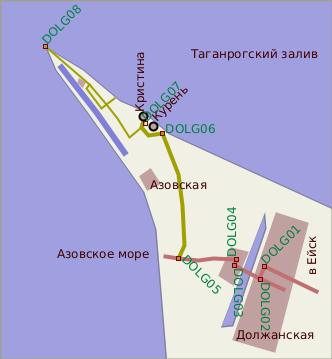 От Ростова до Ейска советуют ехать через Кущевскую, эта дорога считается лучше, чем через Азов. Дальше, объезжая Ейск - двигаться на Должанскую. В Должанской, уперевшись в конце станицы в Т-образный перекресток, нужно сделать "зигзаг" влево-вправо и дальше двигаться по главной дороге, которая, перейдя по дамбе заросшие камышом плавни, делает еще один "зигзаг", на этот раз правый, и входит в лес, которым порос весь широкий "корень" косы. Уже в лесу уходящую левее асфальтированную дорогу надо пропустить, съехав правее на грунтовку. По ней, придерживаясь основного направления, и надо ехать дальше в "конец" косы. Можно ориентироваться на указатели к базе "Кристина", которые встречаются довольно часто. Если ваш обратный путь из Должанской лежит дальше на юг, то, вернувшись до Ейска, можно проехать через станицу Ясенскую, посмотрев сверху на соленое озеро Ханское (в нем берут лечебные грязи для Ейского курорта) и заехав на Ясенскую косу. Для длительной стоянки, однако, Ясенская коса не очень удобна - море слишком близко от дороги. Шоссе Ейск - Ясенская и Ясенская - Новоминская немного похуже, чем до Ейска и Должанки, но это по кубанским меркам, то есть скорость все равно не ограничена ничем, кроме правил.