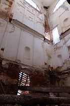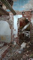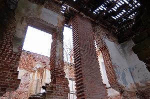 Внутренние интерьеры утрачены навсегда. Рухнувшие колонны, остатки капителей разбросаны повсюду. Можно только догадываться, как выглядел вестибюль с парадной лестницей.