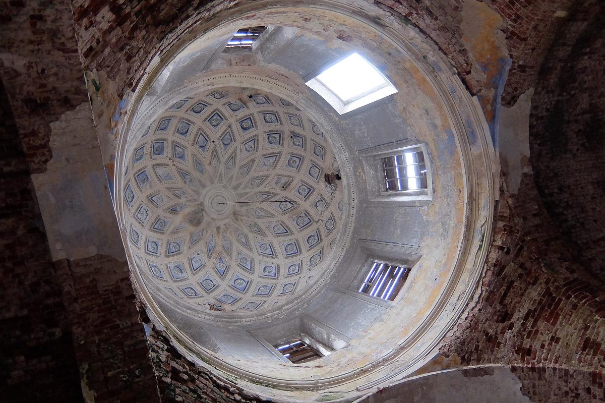 О первоначальной отделке свидетельствует лишь роспись купола под ромбовидные кессоны. Бело-синие кессоны усиливают ощущение объема, окна барабана дают верхний свет.