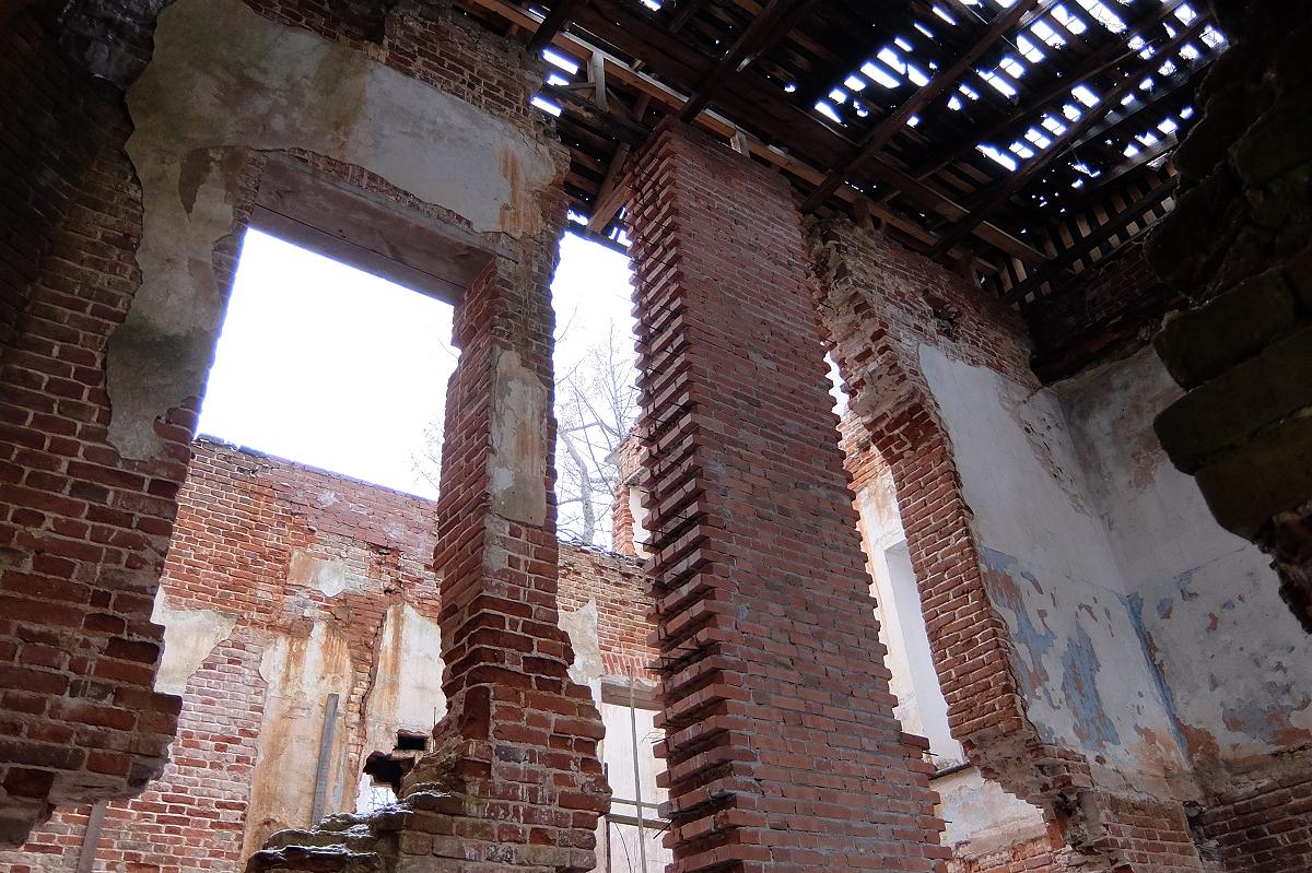 Была сделана обрешетка под крышу и, вероятно, имелось временное покрытие. Зияющие проемы были затянуты целофаном (сейчас он закрывает лишь паладианские окна бельведера).