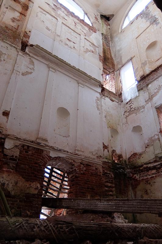 Конечно, деревянные оштукатуренные колонны главного зала не были рассчитаны на жизнь под открытым небом. Их остовы печально лежат под грудой других обломков. Теперь мы можем видеть то, что осталось от внутренней отделки во всю высоту строения.