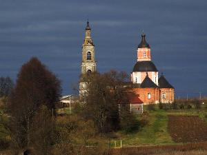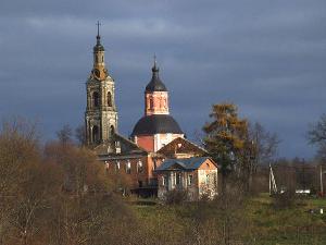 Церковь Всех скорбящих радости построена в 1760-е годы силами крепостных князя П.А.Шаховского. Высокий двусветный восьмерик является композиционным центром храма с лепестковым планом. С церковью соединена притвором стройная четырехъярусная колокольня, выстроенная в 1894 году по проекту С.К.Родионова вместо прежней.