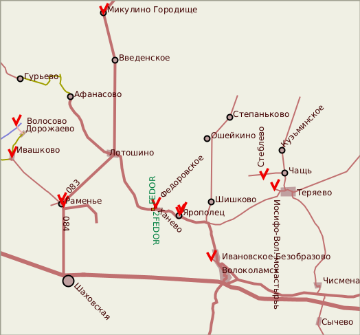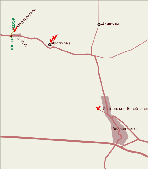 Из Волоколамска по шоссе на Лотошино. После Яропольца (Ярополец можно объехать, если, конечно, нет желания посетить его знаменитые усадьбы), километра через 3-4 на шоссе будет деревня Ханево. Из-за домов деревни справа, за речкой Колпянкой, уже видна высокая колокольня федоровской церкви. В конце деревни (но не доезжая моста через речку) поворот вправо-вниз (путевая точка 2FEDOR) на грунтовую дорогу. После мостика через речку - подъем вверх и вы у цели... почти, то есть у забора (FEDOR). К счастью, через забор усадьба, стоящая на горке, видна довольно хорошо, однако желательно иметь фотокамеру с хорошим зумом.