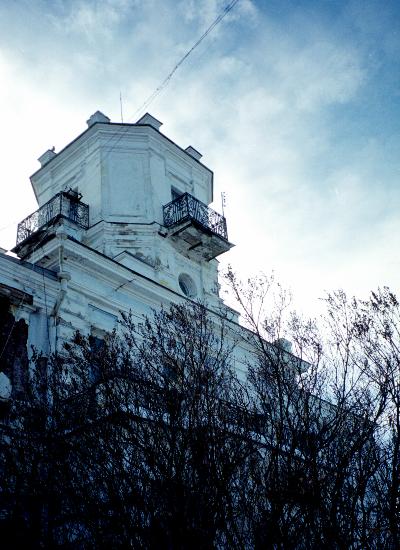 Однако, если взглянуть вверх, можно увидеть симпатичные детали. Довольно выразительна угловая башенка с балкончиками.