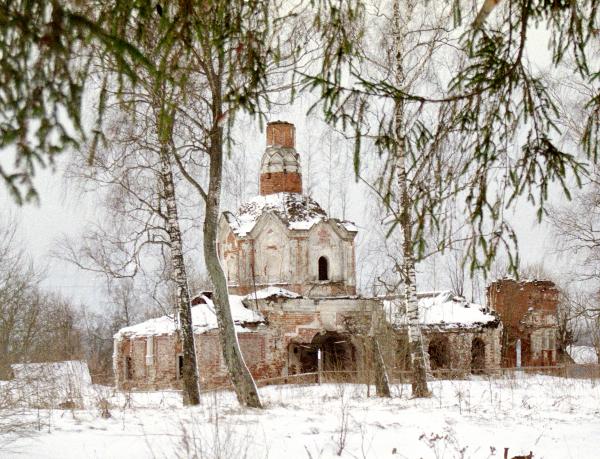 Немногое сохранилось от тех времен: остатки старого парка, да полуразрушенная Тихвинская церковь с частью колокольни. Церковь была построена в первой половине XVIII века, возобновлена в 1775 году и кардинально переделана в духе "национальной" архитектуры в 1864 году. Чуть позже, в 1880-х годах, была пристроена колокольня, сооруженная по проекту С.К.Родионова на средства А.А.Оболенской. Ныне от колокольни остался только первый ярус. Здания сложены из кирпича с применением для отделки белого камня. Несколько перегруженный нарядный декор включает мотивы XVII века. И сейчас выразительная церковь смотрелась еще эффектнее с завершением невысоким стропильным шатром и пощипцовым покрытием граней четверика.В основе композиции - небольшой храм типа "восьмерик на четверике" с отчетливой поперечной осью. Сводчатые перекрытия местами рухнули. Полуподвальная родовая усыпальница под трапезной в основном завалена. Состояние памятника не оставляет никаких надежд... А жаль, места здесь очень красивые. Вниз к реке спускается чудом уцелевшая старая березовая аллея. Бескрайние просторы, речная гладь, заброшенная вотчина могущественных когда-то князей Оболенских...
