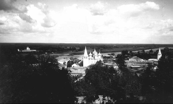 Первоначально городские укрепления возникли на высоком холме над Клязьмой. Здесь в начале XVII века был основан Никольский монастырь, некоторые постройки которого сохранились и поныне. Отсюда открывается удивительный вид. Перед нами панорама Гороховца, каким он был сто лет назад.