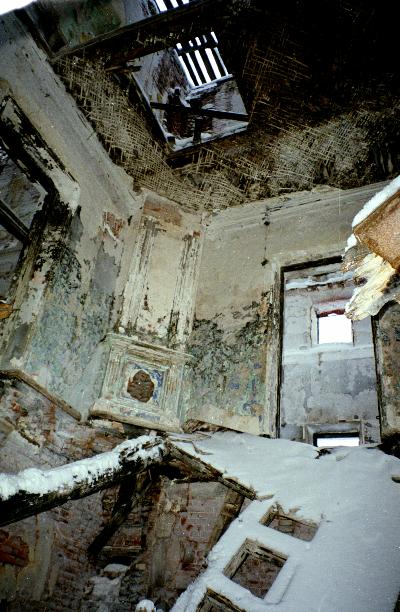 Перекрытия провалились, но пока сохранилась кое-где внутренняя отделка. Еще недавно в вестибюле стояла мраморная лестница, а особое восхищение вызывал большой двухсветный зал, стены и потолок которого были отделаны под искусственный мрамор (штукко), а лепные карнизы поражали изяществом отделки.