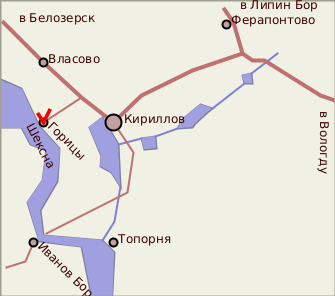 Подъезд, в общем,по карте. Монастырь находится на берегу Шексны в южной части поселка.