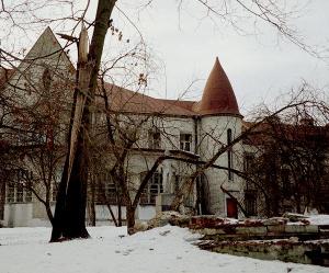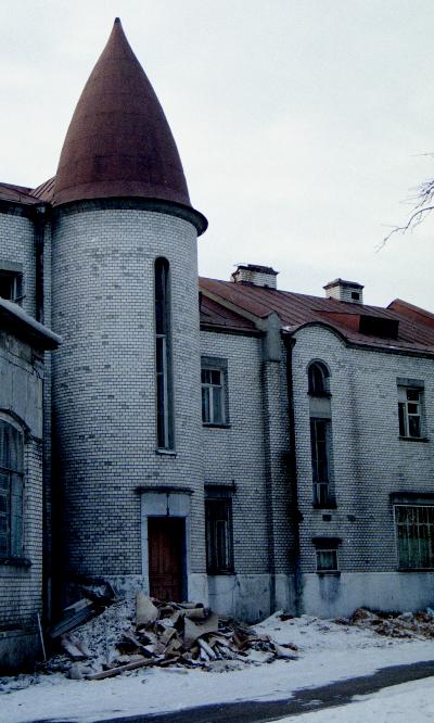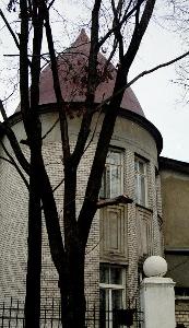 Юго-западная угловая башня. Шлемовидные завершения башен, судя по всему, сохранинились оригинальные, и благодаря им дом не потерял своего романтического очарования. По некоторым сведениям, отчасти сохранились и интерьеры дома (камин и старинная мебель).