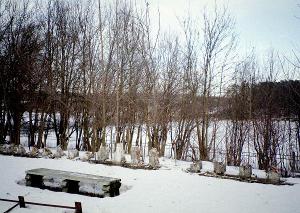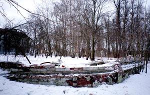 Среди разросшихся деревьев сохранились руины парковых построек. Вероятно, это остатки террасы на спускавшейся к реке главной аллее.