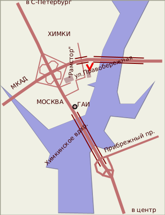 На выезде из Москвы по Ленинградскому шоссе, перед пересечением с кольцевой автодорогой, за постом ГАИ, не доехжая метров 100 до начала развязки, надо повернуть направо, на Правобережную улицу (это первый правый поворот после поста ГАИ). Раньше Правобережная улица начиналась у самой развязки чуть дальше, теперь это заезд на стоянку торгового комплекса "Рамстор". Дорога делает зигзаг влево-вправо, огибая указанную стоянку, а затем прямо-таки упирается в шехтелевский дом. Перед домом улица делает резкий поворот налево и уходит в туннель под МКАД, в Химки (оттуда тоже можно попасть к памятнику, но это несколько сложнее).