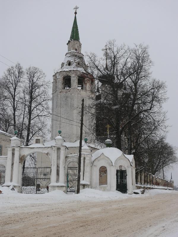 С запада к трапезной примыкает ярусная колокольня с низким четвериком и восьмигранным столпом. Колокольня имеет оригинальное завершение: над ярусом звона расположен узкий усеченный шатер, на который поставлен восьмерик, венчающийся восьмигранным шпилем, как бы продолжающим шатер.