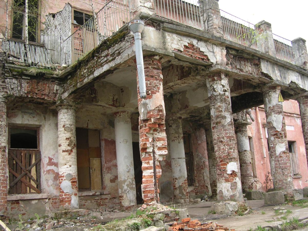 Особую выразительность главному фасаду придает низкий тосканский портик с открытой верандой. Впереди просматриваются остатки пандуса. Когда-то второй портик с полукруглым выступом в центре украшал террасу, связывавшую дом с парком.