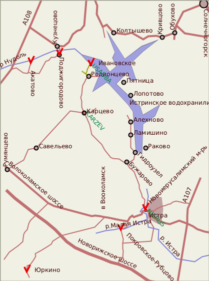 Немало было в Подмосковье усадеб с названием Ивановское. У впадения реки Нудоль в Истринское водохранилище сохранился главный дом одной из таких усадеб. Перед революцией место это называлось Ивановское-Козловское, т.к. последними владельцами усадьбы ( с 1890 г.) были князья Козловские. А вообще-то усадьба старая, основана она была еще в начале XVIII века И.П. и М.П.Гагариными. Московский комендант, князь Матвей Петрович Гагарин, подписавшийся под приговором суда над царевичем Алексеем, сыном Петра I, прославился своими взятками на посту сибирского губернатора, за что и был казнен в конце 1710-х годов. Большие доходы позволили ему обустроить не одну подмосковную усадьбу. Во второй половине XVIII века Ивановское принадлежало И.Я.Блудову, затем - В.Д.Лаптеву. В 1823 - 1852 владельцем был адмирал А.С.Меньшиков, при котором здесь была устроена писчебумажная фабрика. Позднее усадьба перешла к доктору Колесову, затем к купцам Берендеевым, а уже после них - к Козловским. Интересно, что в Ивановском сохранился довольно старый главный дом 1770-х годов. Хоть и немного перестроенный в XIX веке, он однако хорошо сохранил черты своего времени. Позднее с домом был соединен галереей флигель. Хозяйственные постройки середины XIX века утрачены, хотя фундамент одного еще угадывается. Зато рядом с домом на берегу есть современное евроотделанное строение. Сейчас усадьба, вероятно, частное владение, и возможность ее осмотра зависит от благорасположения охраны и отсутствия хозяев.