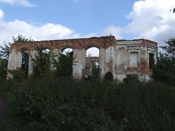С трудом можно угадать в нынешних руинах виденное на старой фотографии. Увы, перед нами все, что осталось от главного дома: боковая стена, да одна башня без крыши. А вокруг заросли травы и кустов.
