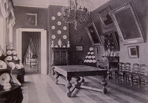 На специальных открытых "горках" был выставлен саксонский сервиз с вензелями Екатерины II. Стены украшал "Мужской портрет" школы Веласкеса, "Наказание Марсия Аполлоном" школы Веронезе, "Снятие с креста" Пальмы Младшего, картины П.Насона, Г.Терборха, В.А.Тропинина, В.К.Шебуева, И.К.Айвазовского, Ф.А.Васильева, В.А.Серова.