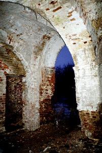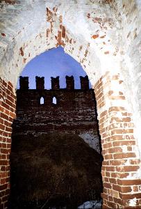 Одноэтажные жилые помещения, расходящиеся под прямым углом от башни, тоже обильно украшены. Окна с кокошниками смотрелись бы совсем жизнерадостно, если бы не отсутствие крыши и полный развал внутри.