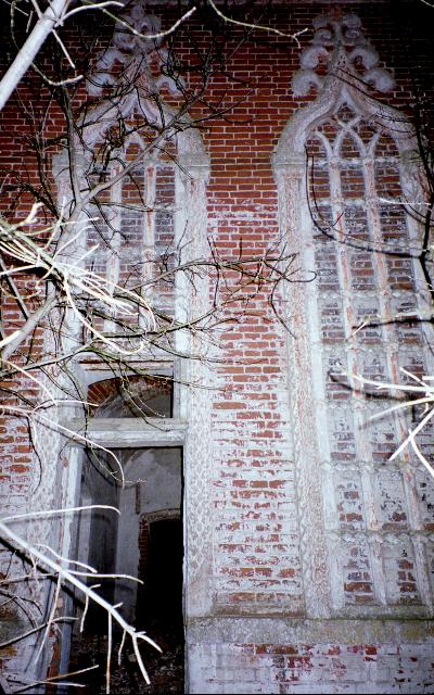Интересна отделка башни фальшивыми стрельчатыми окнами, в которых есть и маленькие настоящие. Белокаменная отделка смотрится очень живописно на красном кирпиче.