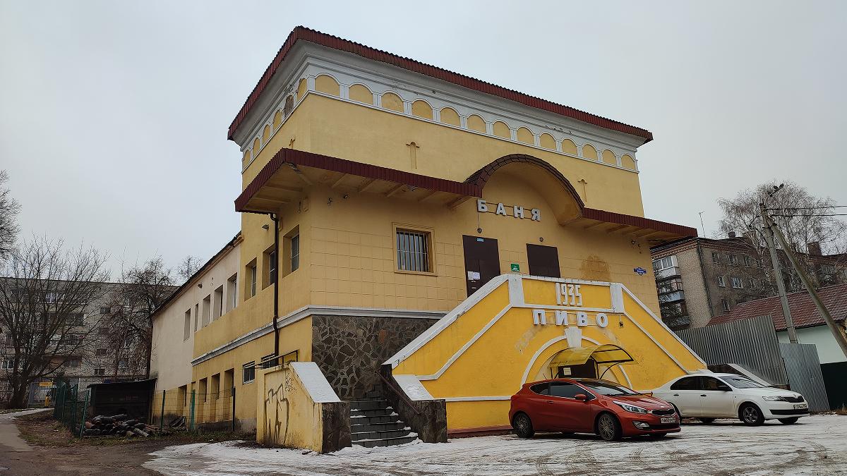 Далее по шоссе — баня, функционирующая со времен позднего конструктивизма. Весьма торжественное сооружение, построенное в годы, когда чистота рабочего класса считалась первостепенной государственной задачей.