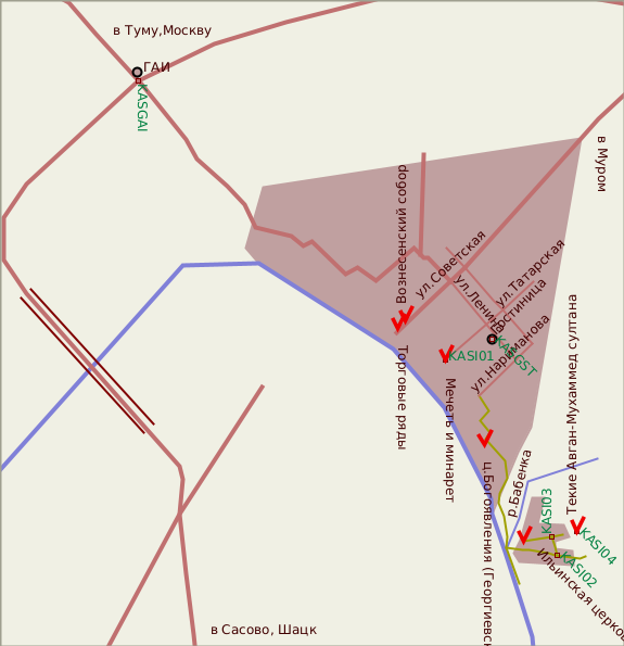 Самая старая гипотеза, идущая еще от знаменитого касимовского архитектора И.С.Гагина, указывала на высокий "мыс" при впадении в Оку речки Бабенки как на вероятное место древнего городища (примерно там, где сейчас стоит Богоявленская церковь). По свидетельству Гагина, до регулярной перепланировки города там еще сохранялись оборонительные валы. Однако попытки раскопок, предпринимавшиеся как в середине XX века, так и на рубеже XX-XXI веков, оказывались безрезультатными: никаких свидетельств существования домонгольского поселения здесь не нашли.