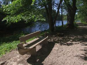 Дальше дорога ведет в большой старый парк. Вдоль дорожек - скамьи в виде лодок с железными носовыми кольцами. Полуспущенный ров отделяет парк от замка.
