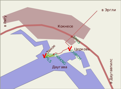 По правобережному (по течению) шоссе вдоль Даугавы. При въезде в город Кокнесе со стороны Даугавпилса нужно повернуть налево (путевая точка 2PILS), дальше - еще раз налево, и вы окажетесь у церкви (путевая точка CHIRCH) на берегу Даугавы. Вдоль берега вниз по течению, петляя, идет узкая асфальтированная дорожка, она заканчивается площадкой для парковки (PARKNG). Дальше нужно войти в парк (здесь уже появляются указатели на pils drupas, то есть руины замка) и продолжить путь вдоль берега. Вскоре на мысу покажется и сам замок (точка PILS).
