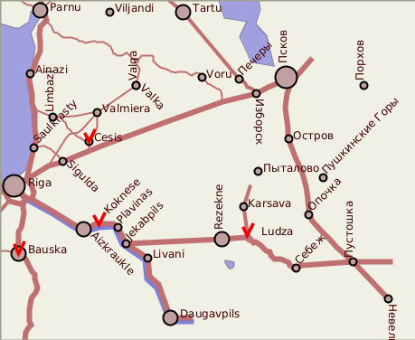 Кокнесе - очень красивое место. Руины замка прямо на берегу полноводной реки выглядят просто волшебно. Уже в начале XIII века здесь был деревянный замок, который являлся центром феодального княжества. Некоторое время оно находилось в зависимости от полоцкого князя, однако старалось жить в мире и с рижским епископом Альбертом. Неизбежные столкновения полоцкого князя с крестоносцами отразились и на Кокнесе, князь которого был вынужден постоянно лавировать. В конце концов, он сжег свою замок и бежал в русские земли. Крестоносцы решили возвести на месте деревянного замка каменный. В 1210 году на недостроенный замок напали литовцы, но взять его не смогли. Военные разборки случались довольно регулярно, в том числе с новгородцами и псковичами. Постепенно Кокнесе стал крупным торговым центром на реке Даугаве, в 1277 году получил статус города. В XIV веке его приняли в Ганзейский союз немецких городов. С 1420 года Кокнесе стало летней резиденция Рижского архиепископа, двор которого насчитывал 800-900 человек. В 1424 году рижским архиепископом был назначен Хеннинг Шарпенберг, который укрепил Кокнесский замок, лично руководя земляными и строительными работами. С западной стороны он приказал построить башню, названную “Длинный Хеннинг”. Позднее, во время войны между рижским архиепископом и магистром Ливонского ордена магистр фон дер Борх захватил Кокнесский замок и приказал заключить архиепископа Сильвестра Стодевешера в башне замка, где тот через некоторое время и умер. Папа Сикст IV отлучил магистра Борха и его брата, претендовавшего на место рижское архиепископа, наложил интердикт на всю область Кокнесе и назначил архиепископом Рижским Стефана Грубе, который в 1481 году отнял Кокнесе у магистра Борха и разорил окрестные земли. Когда в Риге победила Реформация, в 1523 году, изгнанные лютеранами доминиканцы вместе с другими монахами покинули Ригу и отправились в Кокнесе, где нашли временное пристанище. Через некоторое время архиепископ Томас Шеннинг перенес резиденцию архиепископов в Кокнесе, где и скончался в 1539 году. С 1530 по 1547 год в Кокнесе чеканили особые церковные деньги с гербом рижского архиепископа без знаков ордена. В конце концов Орден начал военные действия и, взяв архиепископа в плен, отправил его в тюрьму Гауйенского замка. Считается, что во время этой разборки сгорел весь архив архиепископов, находившийся в замке Кокнесе. В 1559 году между Польшей и Ливонским орденом был заключен оборонный договор,по которому Польша предоставляла ордену войско для борьбы с Русью. За это Ливонский орден обещал передать Польше несколько приграничных областей и крепостей, в том числе Кокнесе, куда поляки вступили той же осенью. В 1561 году архиепископ Вильгельм Бранденбургский получил от поляков крепость в Бауске взамен Кокнесе. В 1562 году Ливонский орден перестал существовать. В 1577 году Кокнесе было захвачено и разорено войсками Ивана Грозного, но уже в 1578 поляки отвоевали замок обратно. В 1601 году Кокнесе захватили шведы. По несколько месяцев замок находился то в руках шведов, то поляков. В результате город достался шведам, которые построили новые укрепления, так как старый орденский замок не отвечал их требованиям. Шведская королева в 1650 году подтвердила привилегии Кокнесе, что способствовало быстрейшему восстановлению города после военной разрухи.