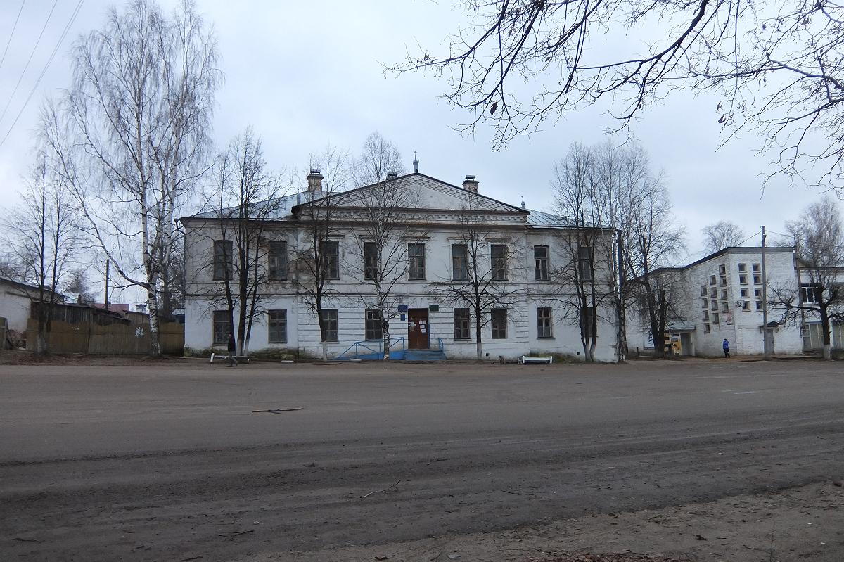 Здание присутственных мест возведено около 1809 года по образцовому проекту А.Д.Захарова. Комплекс административных построек включал главный копрус и три флигеля: два по стронам. В северном была конюшня и хранился противопожарный инвентарь, в южном располагались кухня, людская и каретный сарай. Эти два флигеля не сохранились, зато сохранился третий (тюремный), построенный в глубине двора.