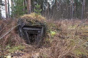 В отличие от зерносклада погреб, кажется, вот-вот рухнет. Он представляет собой бревенчатый сруб, врезанный в почву и засыпанный поверх земляным холмом.