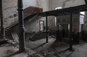 Особо выразителен был парадный вестибюль с чугунной лестницей, чугунными плитами лестничных площадок и чугуннми каннелированными колоннами.