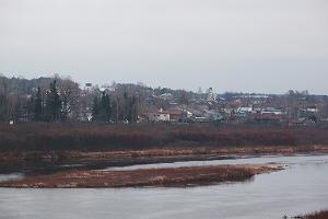 Город раскинулся на высоком левом берегу реки. Издали видны прибрежные постройки, храмы, пожарная каланча.